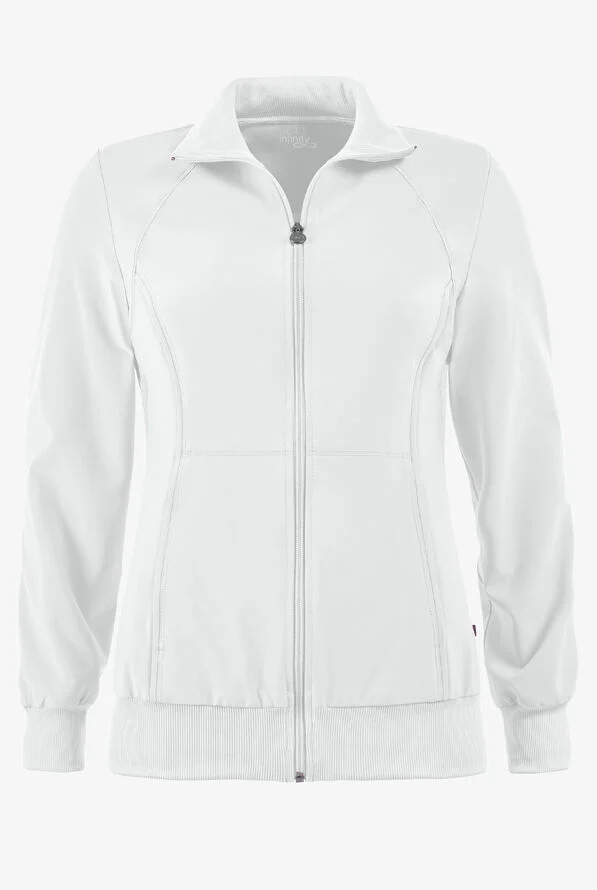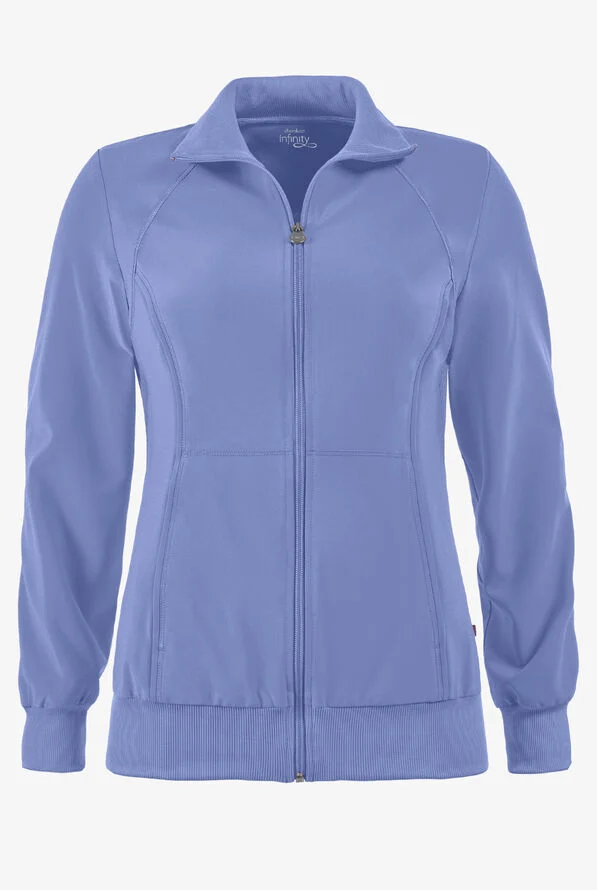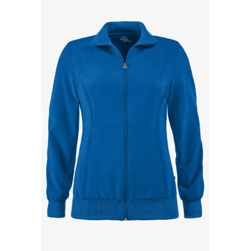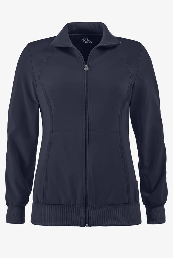 A Contemporary fit, sporty zip front jacket features front and back shoulder yokes, front princess seams with flat piping, hidden pockets with a zipper closure and a logo zipper pull. The back panel, collar, cuffs and waistband are made in a stretch rib knit for extra comfort. Coverstitch detail throughout. Center back length: 26". The comfortable stretch poplin fabric and super stretchy rib knit is the perfect combo for healthcare professionals.