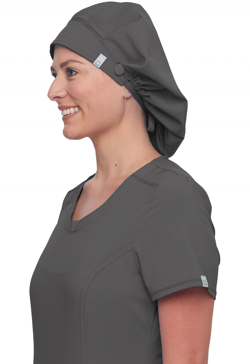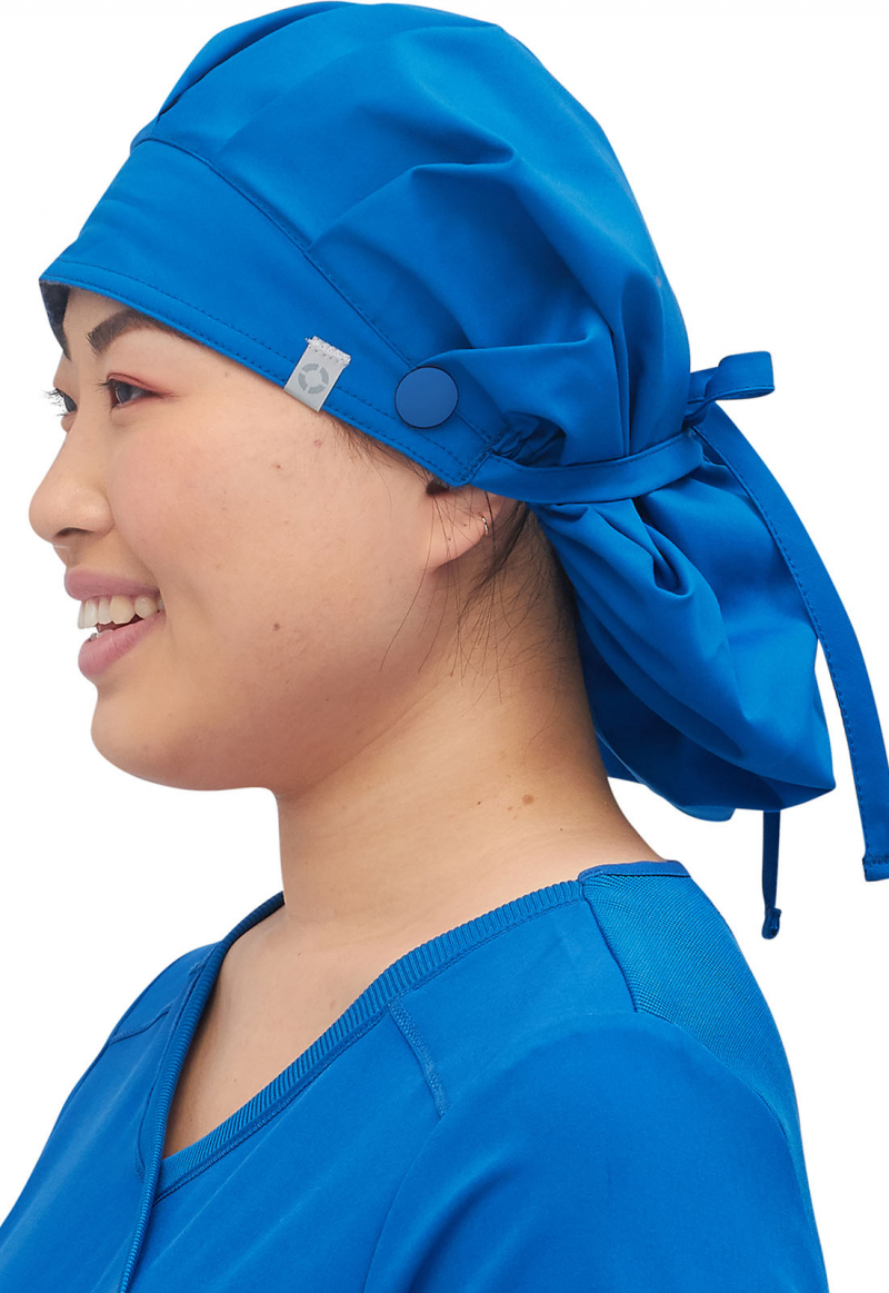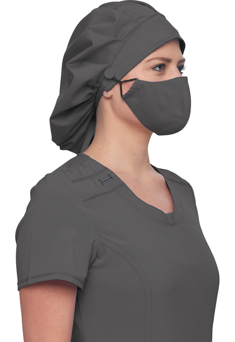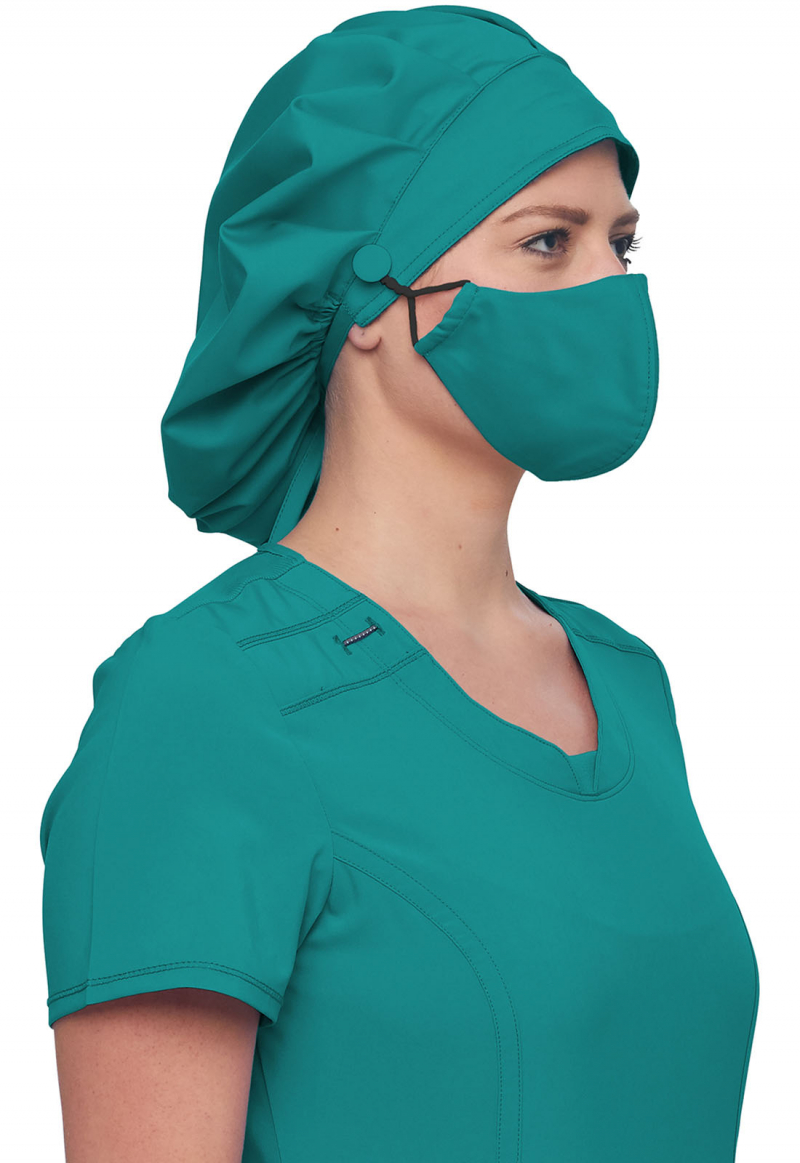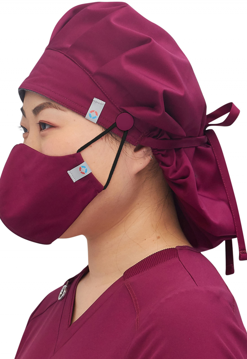 This roomy bouffant scrubs hat features buttons by ears to comfortably hold the protective face mask in place. (Mask sold separately.) Hat also includes front pleats with enough fullness for complete hair coverage and terry cloth sweatband for comfort. Back elastic plus adjustable ties for a secure fit. Certainty label on left side. Unisex fit
