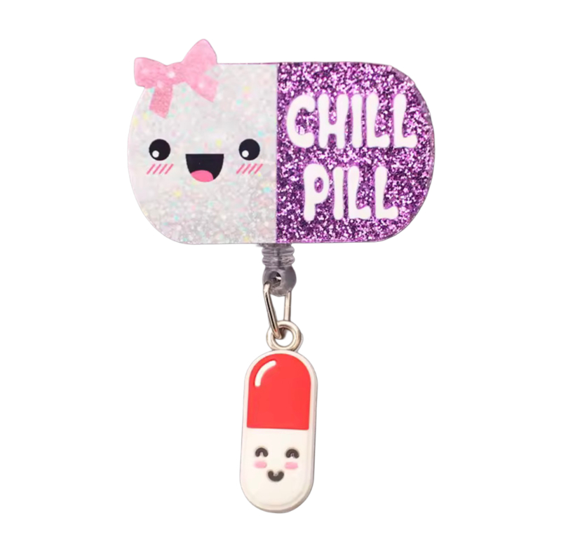 Porta ID brillante con diseño de cápsula “chill pill”. Divertido y perfecto para añadir un toque cute y relajado a tu uniforme.
