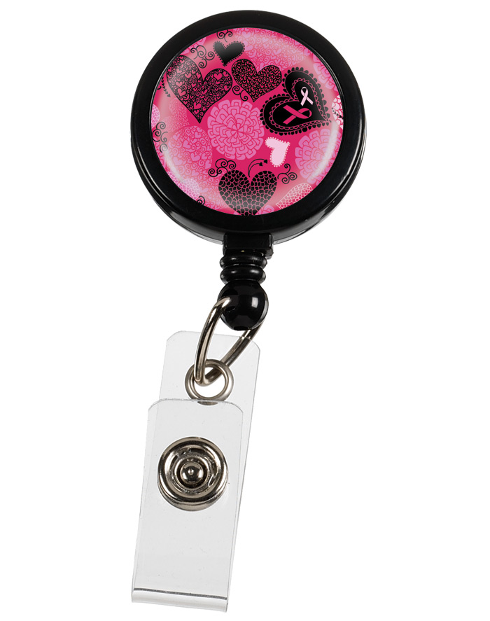 Fashionable Retracteze™ ID badge holders extend to 23". Metal clip on back enables fastening to apparel. Button-snap ID holder can also be used to carry keys. A portion of the sale of all Pink Ribbons items is donated to the American Cancer Society.