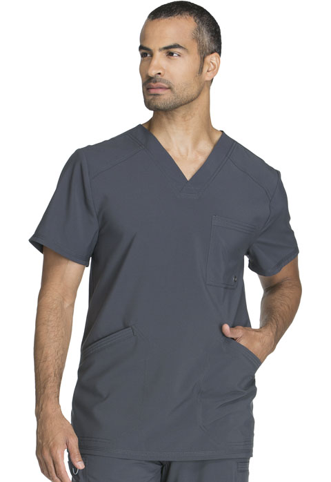 A Men’s Athletic fit V-neck top features a chest pocket with grommet detail, front welt pockets with triple-needle topstitching, front and back yokes, and stretch rib knit back panels for extra comfort. Center back length: 29 1/2”