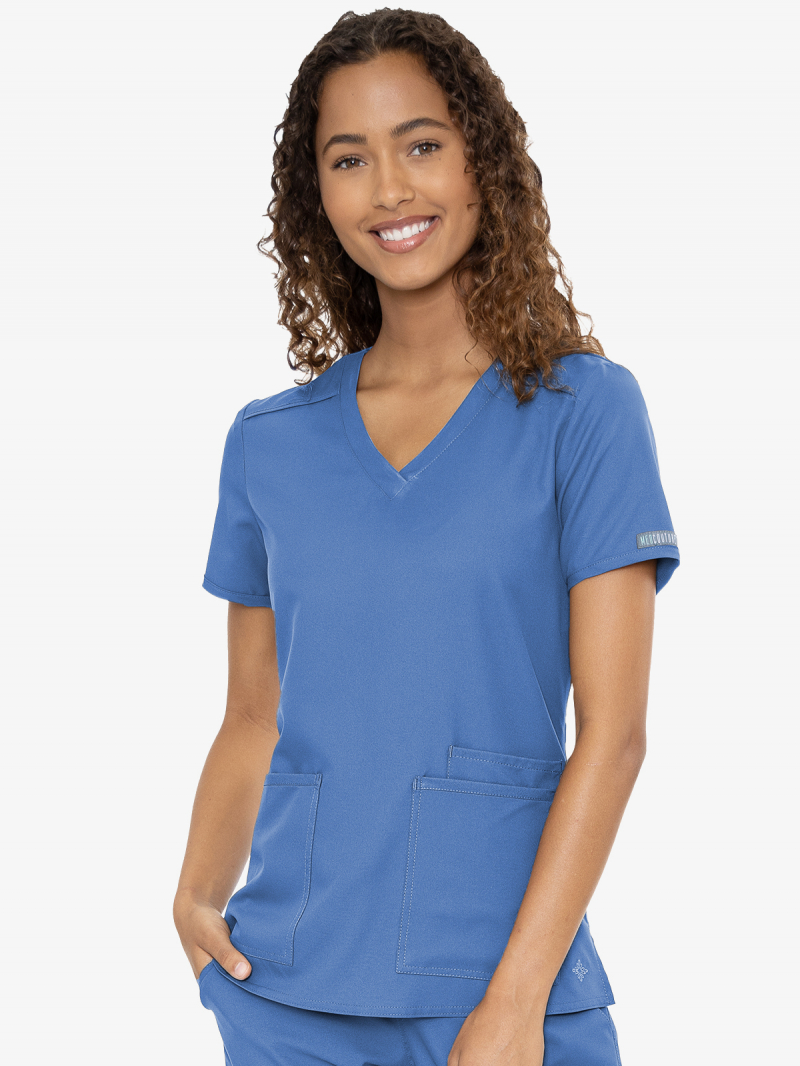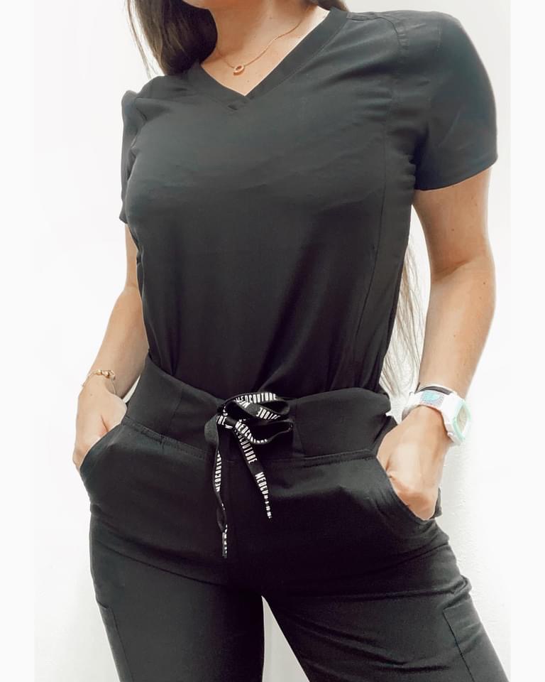 This top holds a standard V-neck with self-binding detail at the shoulder.
