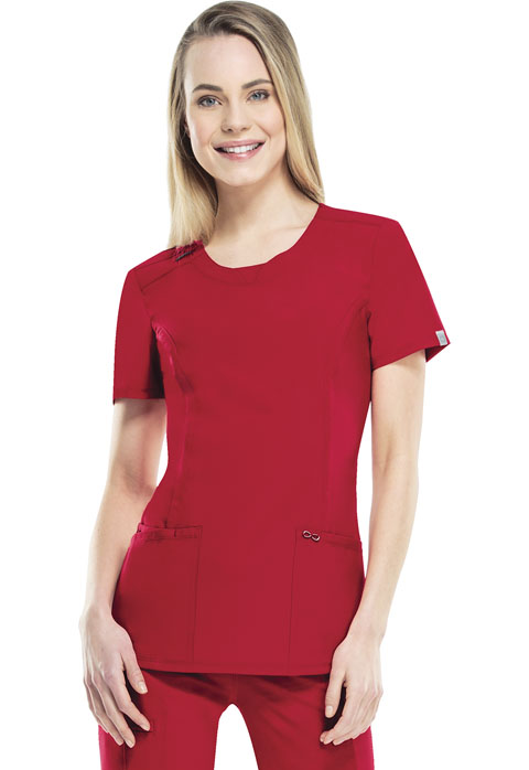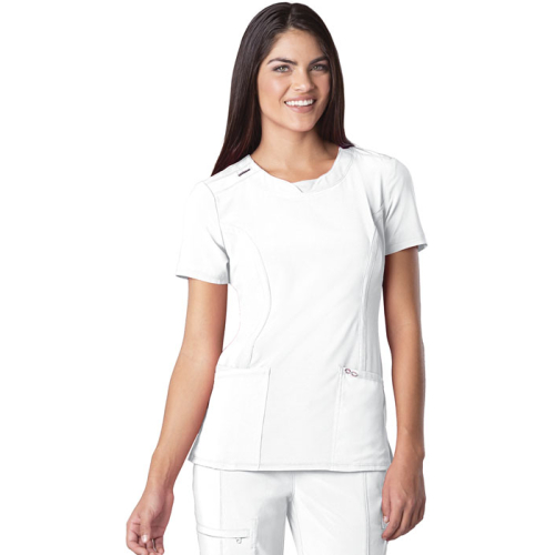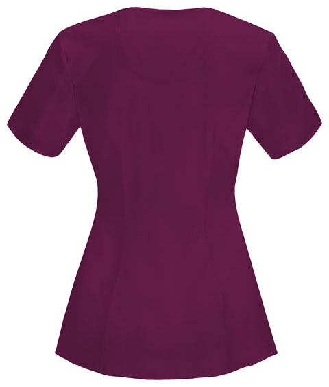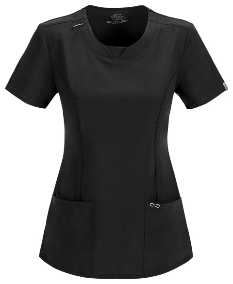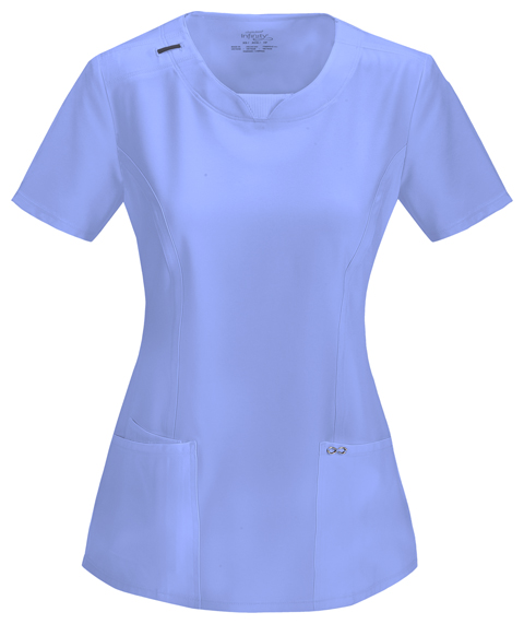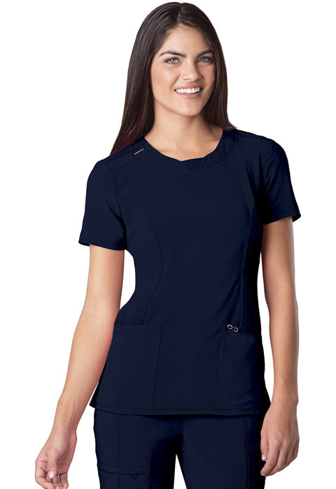 A Contemporary fit round neck top with a rib knit inset at the front neckband also featured are shoulder yokes, a bungee I.D. badge loop on the right shoulder, front and back princess seams, two patch pockets, one interior pocket, and side vents. Stretch rib knit at the center back panel gives this top its slimming shape and allows for extra movement and comfort. Coverstitch detail throughout. Center back length: 26"