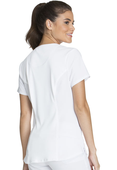 A Contemporary fit V-neck top features a rib waist inset and stretch rib knit panel at the center back for a slenderizing effect, as well as for extra movement and comfort. Also featured are two patch pockets, an interior pocket, pencil stitch, bungee I.D. badge loop, front and back princess seams, a shirttail hem, side vents and coverstitch detail throughout. Center back length: 26”. The comfortable stretch poplin fabric and super stretchy rib knit is the perfect combo for healthcare professionals.