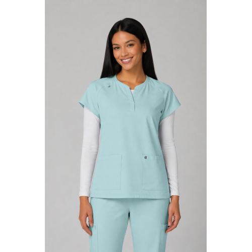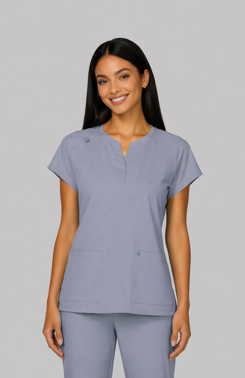Reese Top– Blusa moderna con cuello en V abierto, mangas raglán para mayor movilidad, dos bolsillos frontales funcionales, 26 pulgadas de largo, tela strech 100% poliéster y diseño comodo con aberturas laterales para facilitar movimiento.