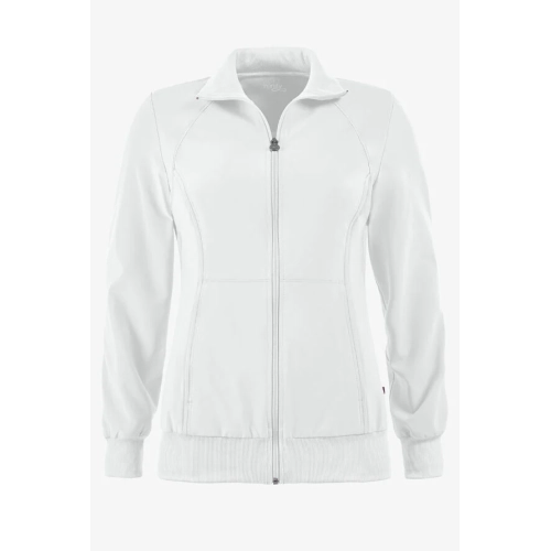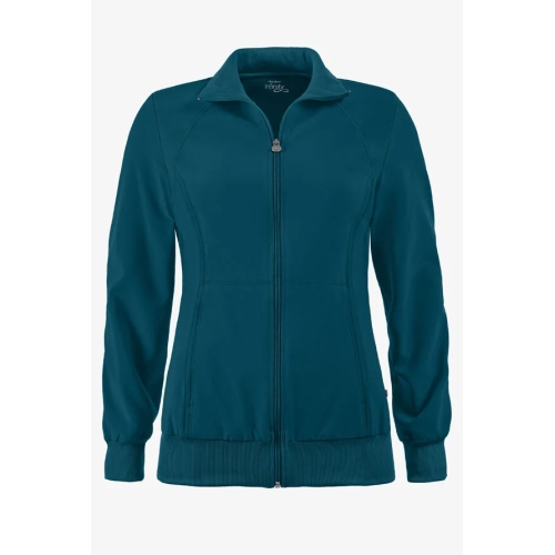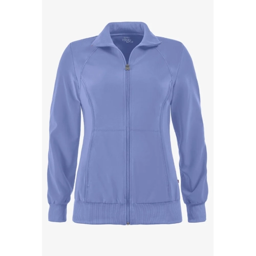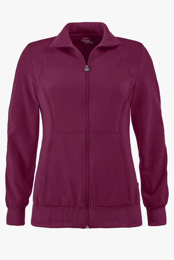 A Contemporary fit, sporty zip front jacket features front and back shoulder yokes, front princess seams with flat piping, hidden pockets with a zipper closure and a logo zipper pull. The back panel, collar, cuffs and waistband are made in a stretch rib knit for extra comfort. Coverstitch detail throughout. Center back length: 26". The comfortable stretch poplin fabric and super stretchy rib knit is the perfect combo for healthcare professionals.