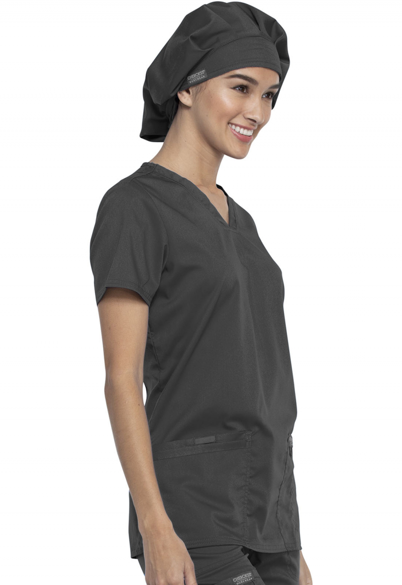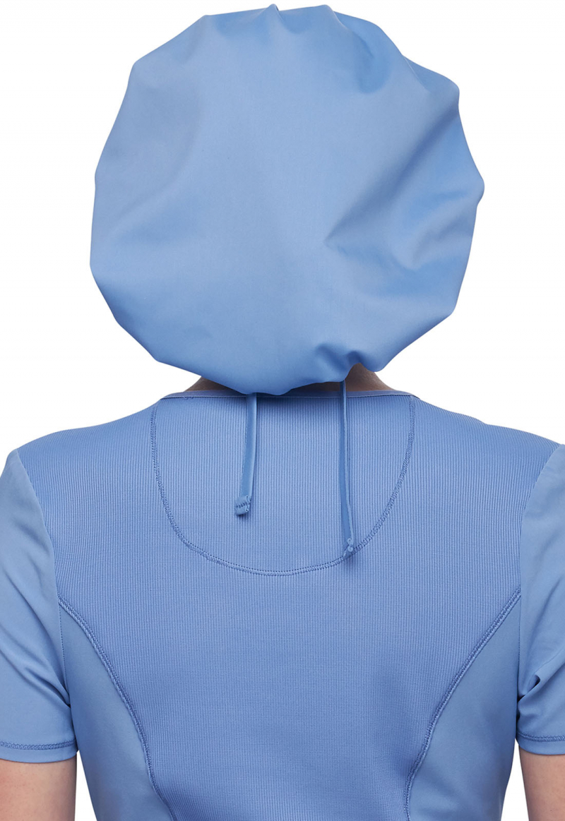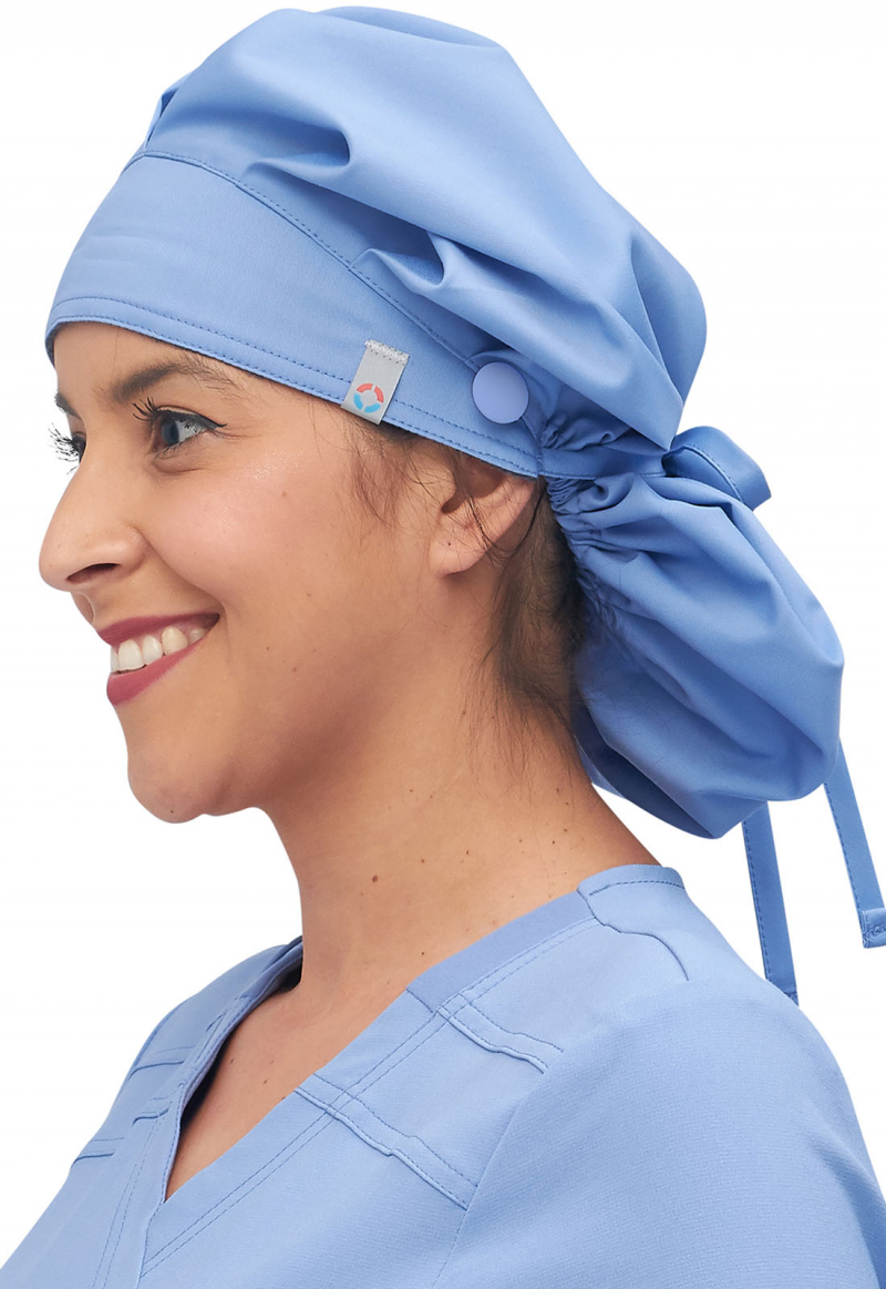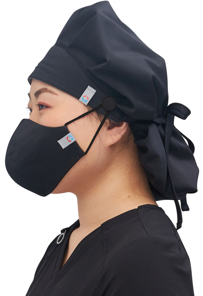 This roomy bouffant scrubs hat features buttons by ears to comfortably hold the protective face mask in place. (Mask sold separately.) Hat also includes front pleats with enough fullness for complete hair coverage and terry cloth sweatband for comfort. Back elastic plus adjustable ties for a secure fit. Certainty label on left side. Unisex fit