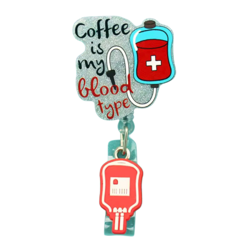 Porta ID divertido con diseño de café y bolsa de sangre. Perfecto para profesionales de la salud que no funcionan sin su dosis diaria de café.