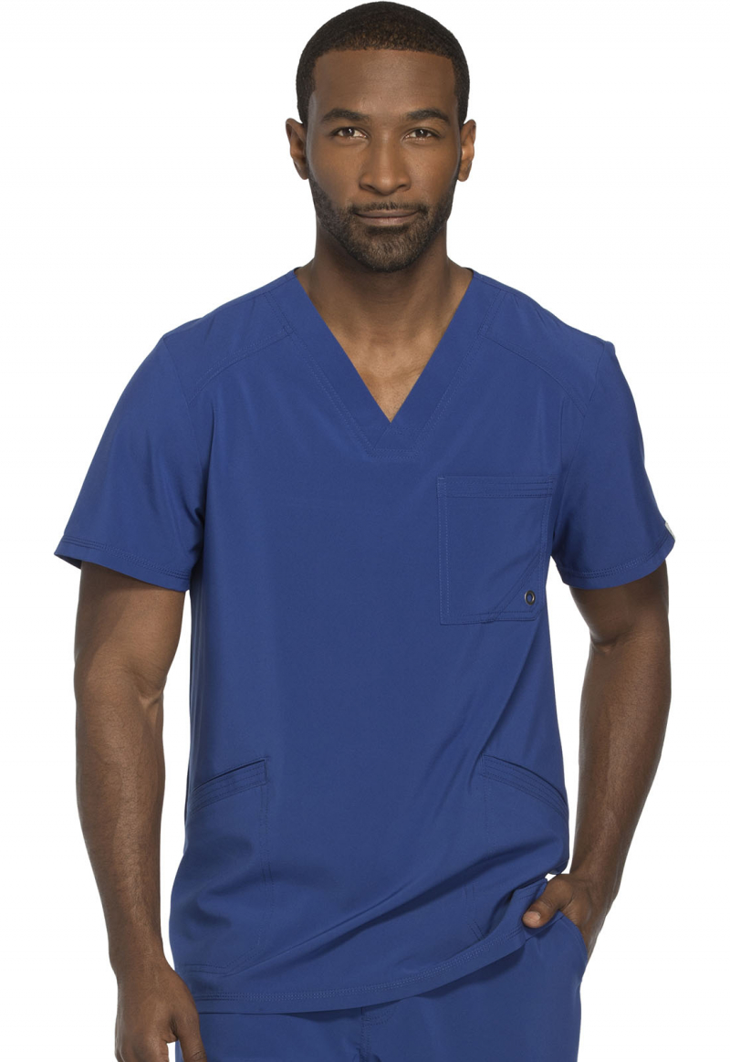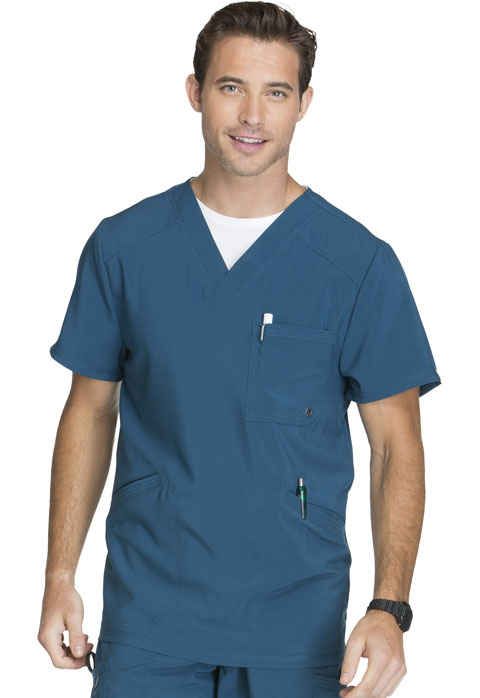 A Men’s Athletic fit V-neck top features a chest pocket with grommet detail, front welt pockets with triple-needle topstitching, front and back yokes, and stretch rib knit back panels for extra comfort. Center back length: 29 1/2”