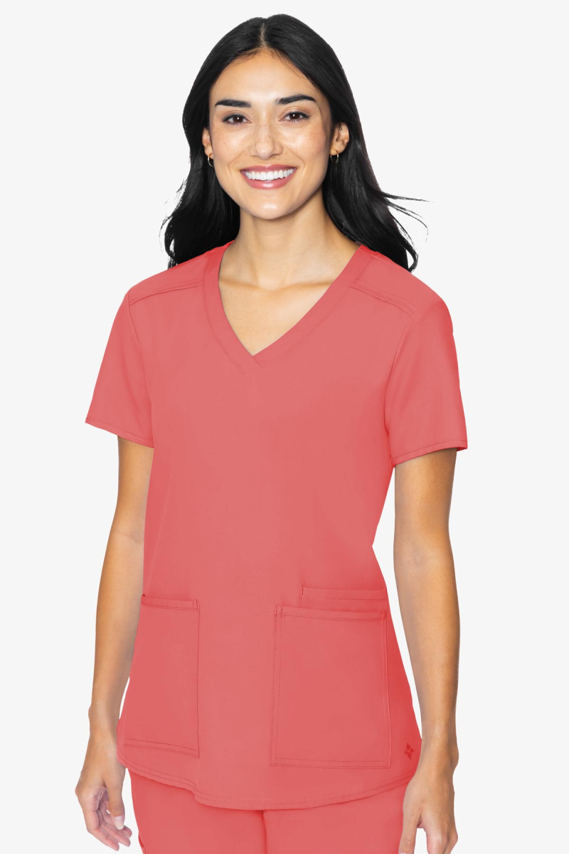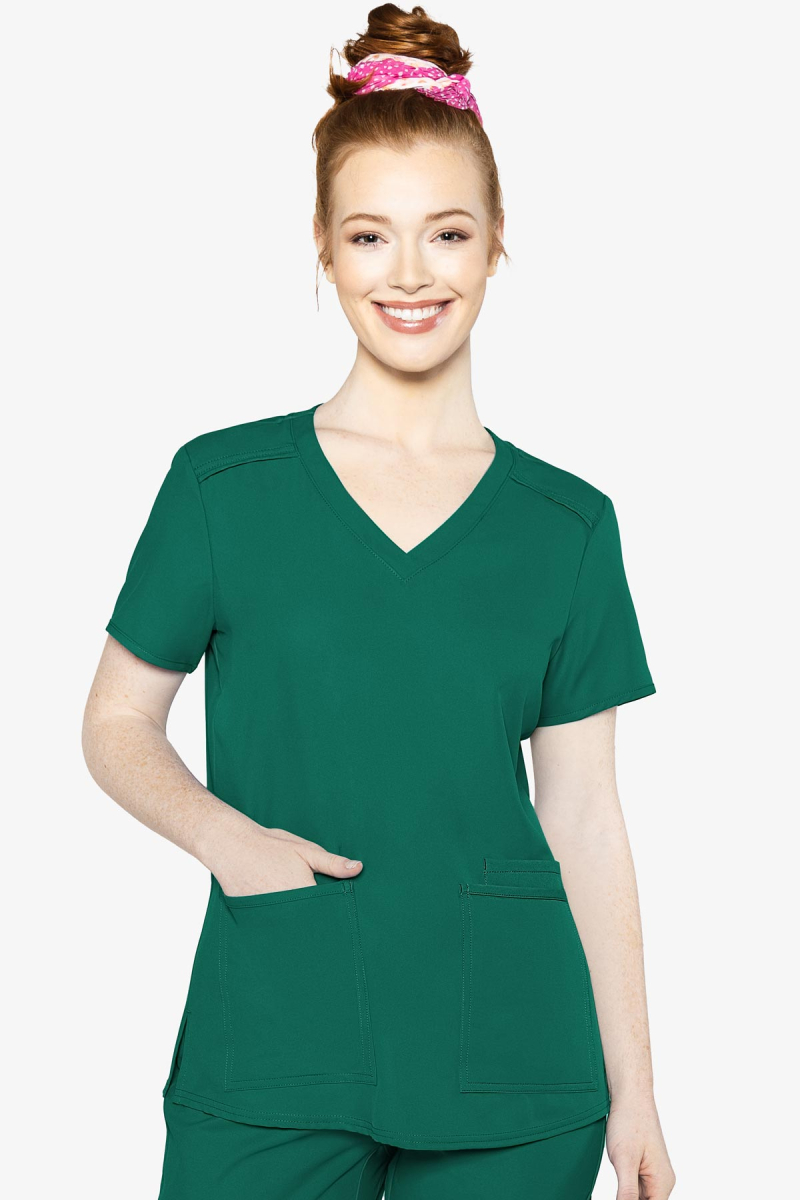 This top holds a standard V-neck with self-binding detail at the shoulder.