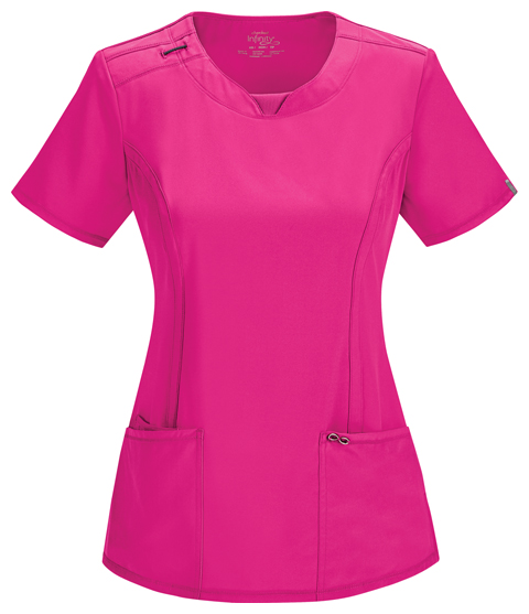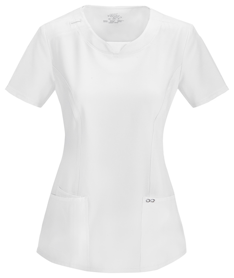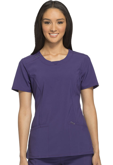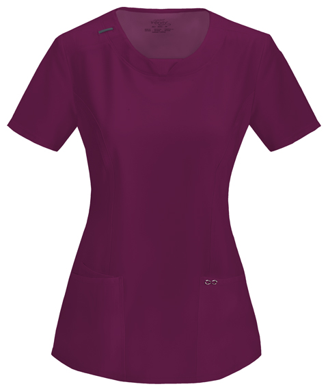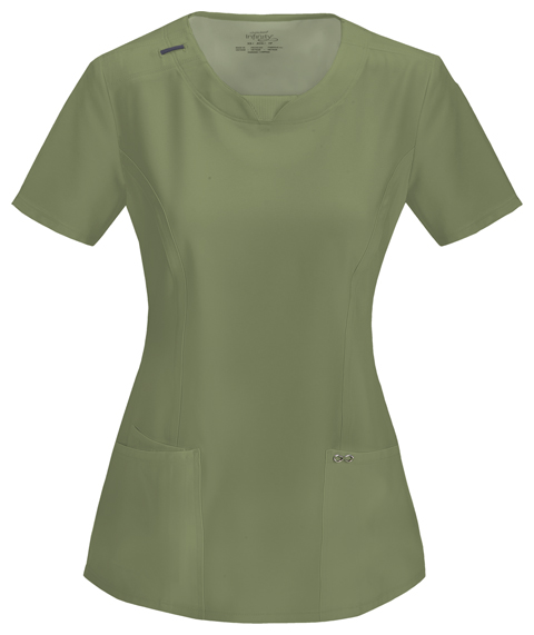 A Contemporary fit round neck top with a rib knit inset at the front neckband also featured are shoulder yokes, a bungee I.D. badge loop on the right shoulder, front and back princess seams, two patch pockets, one interior pocket, and side vents. Stretch rib knit at the center back panel gives this top its slimming shape and allows for extra movement and comfort. Coverstitch detail throughout. Center back length: 26"