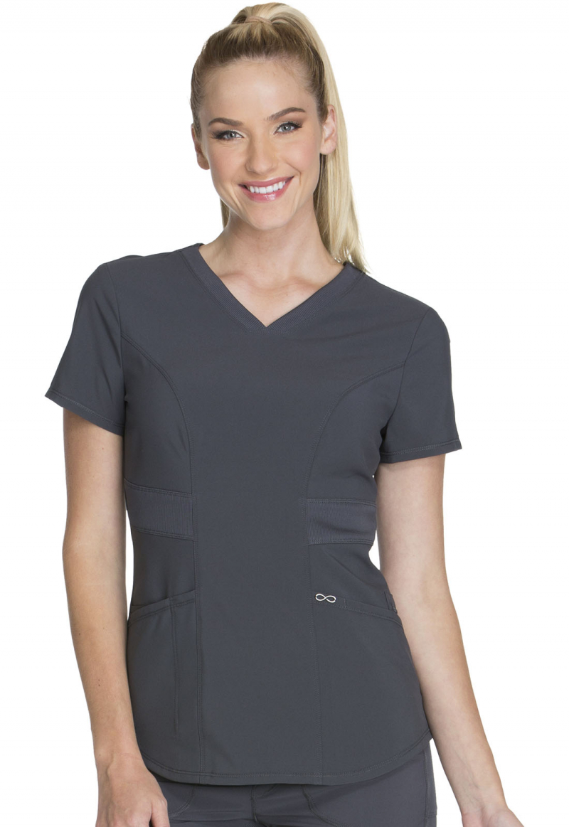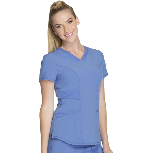 A Contemporary fit V-neck top features a rib waist inset and stretch rib knit panel at the center back for a slenderizing effect, as well as for extra movement and comfort. Also featured are two patch pockets, an interior pocket, pencil stitch, bungee I.D. badge loop, front and back princess seams, a shirttail hem, side vents and coverstitch detail throughout. Center back length: 26”. The comfortable stretch poplin fabric and super stretchy rib knit is the perfect combo for healthcare professionals.