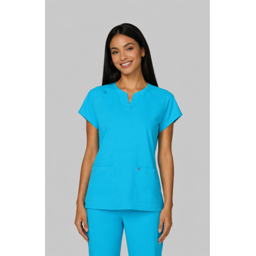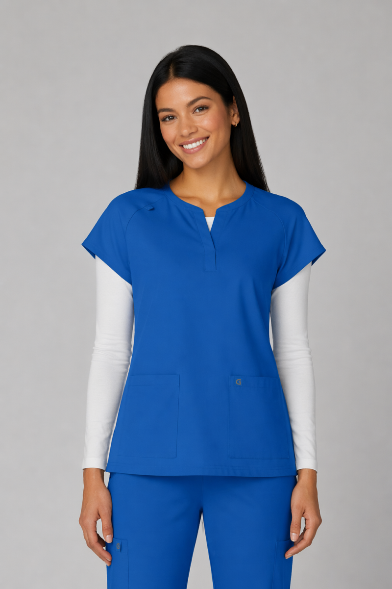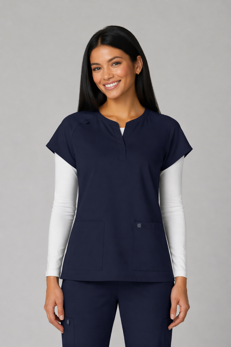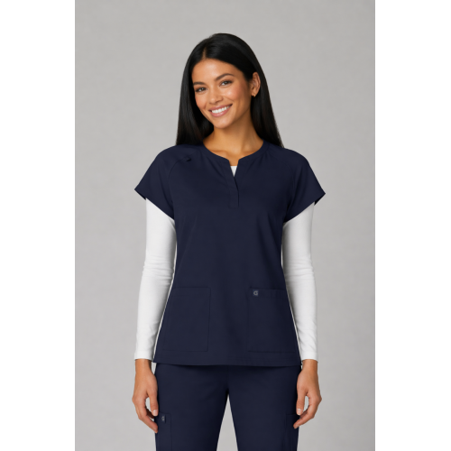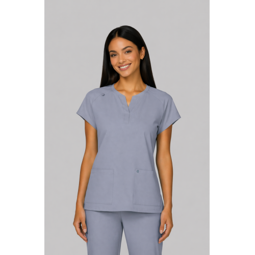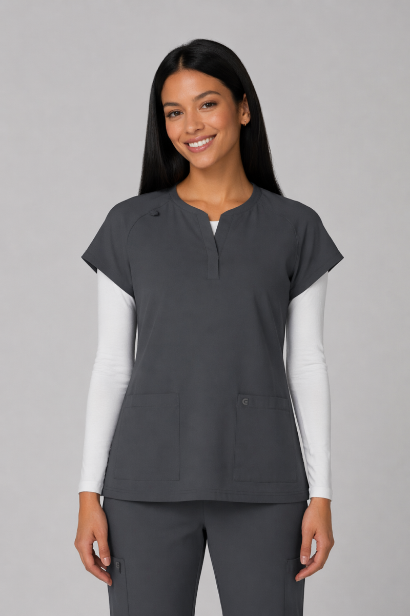 Reese Top– Blusa moderna con cuello en V abierto, mangas raglán para mayor movilidad, dos bolsillos frontales funcionales, 26 pulgadas de largo, tela strech 100% poliéster y diseño comodo con aberturas laterales para facilitar movimiento.